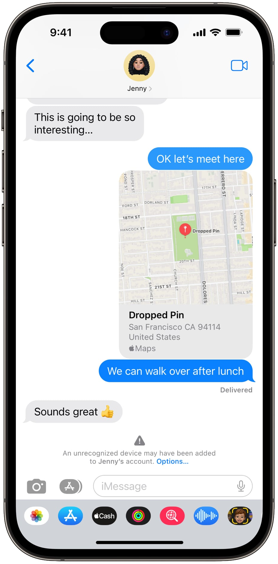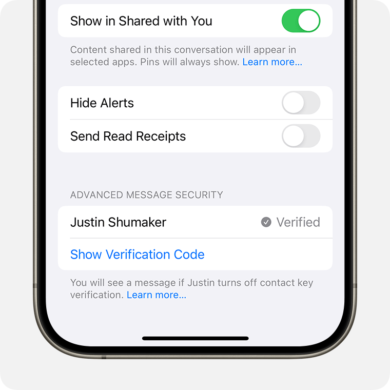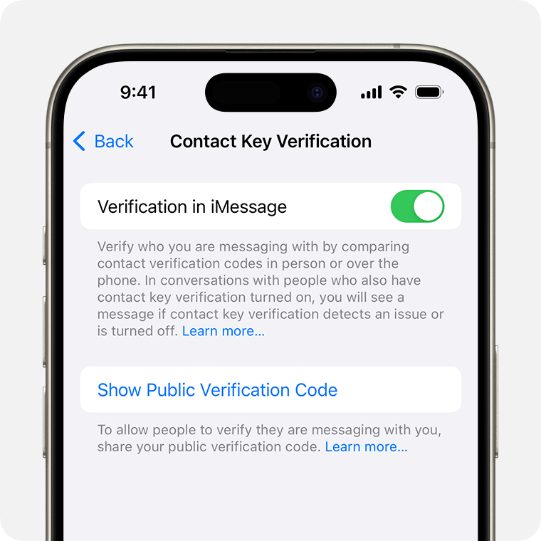 You can use Contact Key Verification to receive automatic alerts that help verify you’re communicating only with the people you intend. You can also generate unique codes that you and your contacts can compare simultaneously in the Messages app to further verify each other’s identities. Additionally, you can post your Public Verification Code to a social media account so other people can confirm that it’s you when they send you a message, and you can save other people’s codes in the Contacts app.